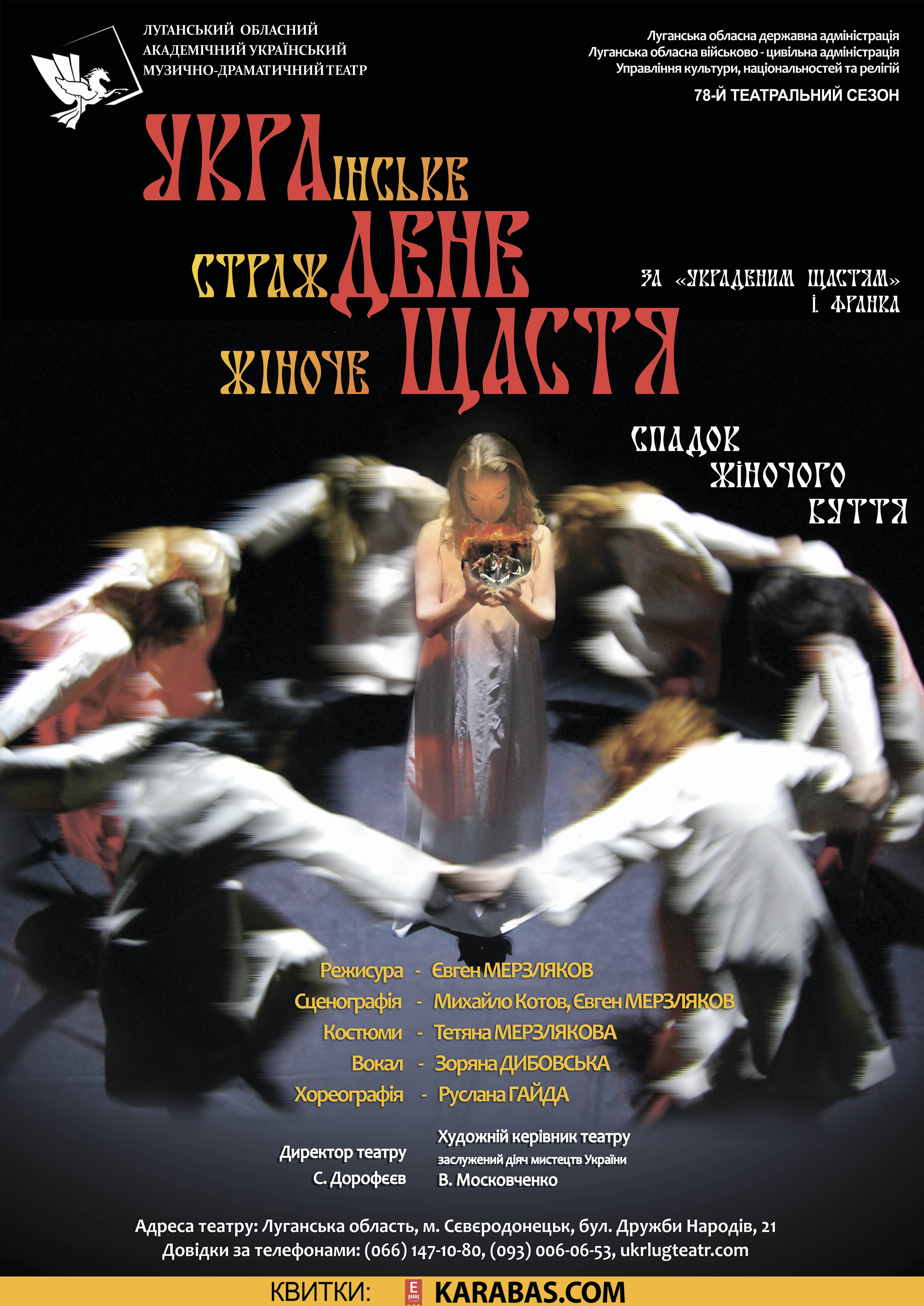 Луганський обласний академічний український музично-драматичний театр запрошує на виставу за Іваном Франком «Украдене щастя»,спадок жіночого буття на 1 дію.