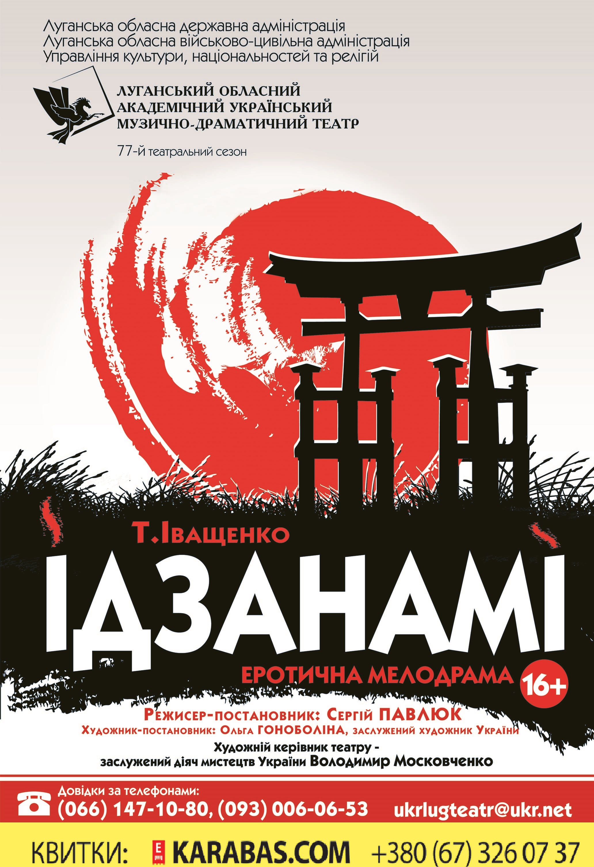 Луганський обласний академічний український музично-драматичний театр запрошує на виставу "Ідзанамі" Т. Іващенко. Еротична мелодрама на 1 дії.