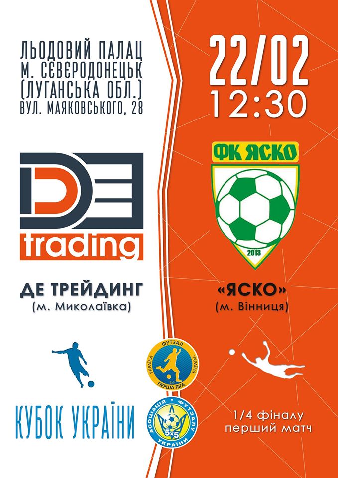 В суботу, 22 лютого, відбудеться матч 1/4 фіналу Кубку України з футзалу. "ДЕ Трейдинг" (Миколаївка) - "ЯСКО" (Вінниця). Льодовий палац. Початок 12:30