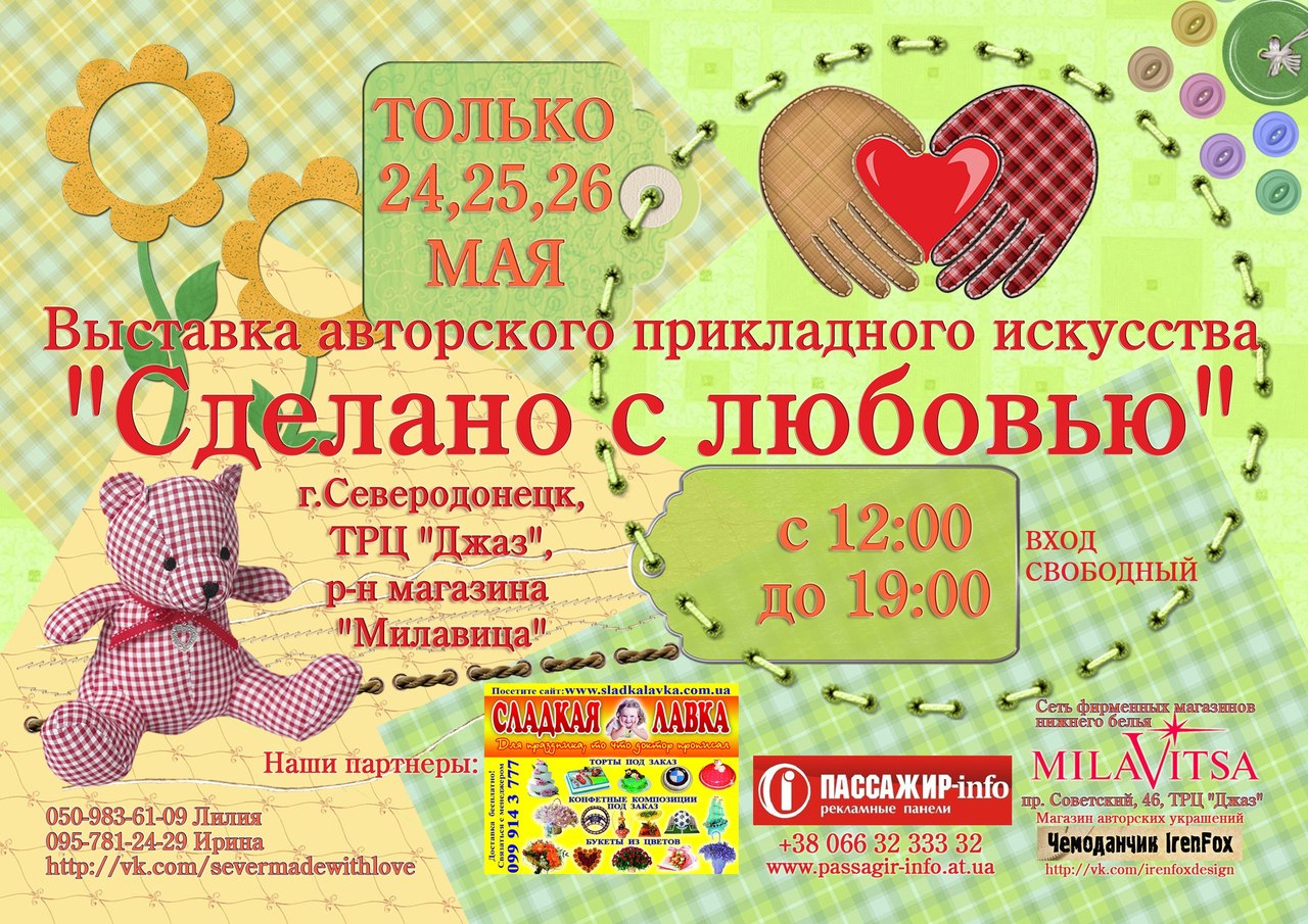 24, 25, 26 мая с 12.00 до 19.00 приглашаем мастеров и любителей прекрасного принять участие в выставке авторского прикладного искусства "Сделано с любовью"!