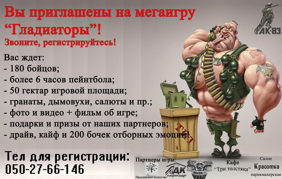 20 октября клуб АК-83 приглашает всех любителей экстремального отдыха на МегаИгру «Гладиаторы». Общее количество участников составит 180 человек.