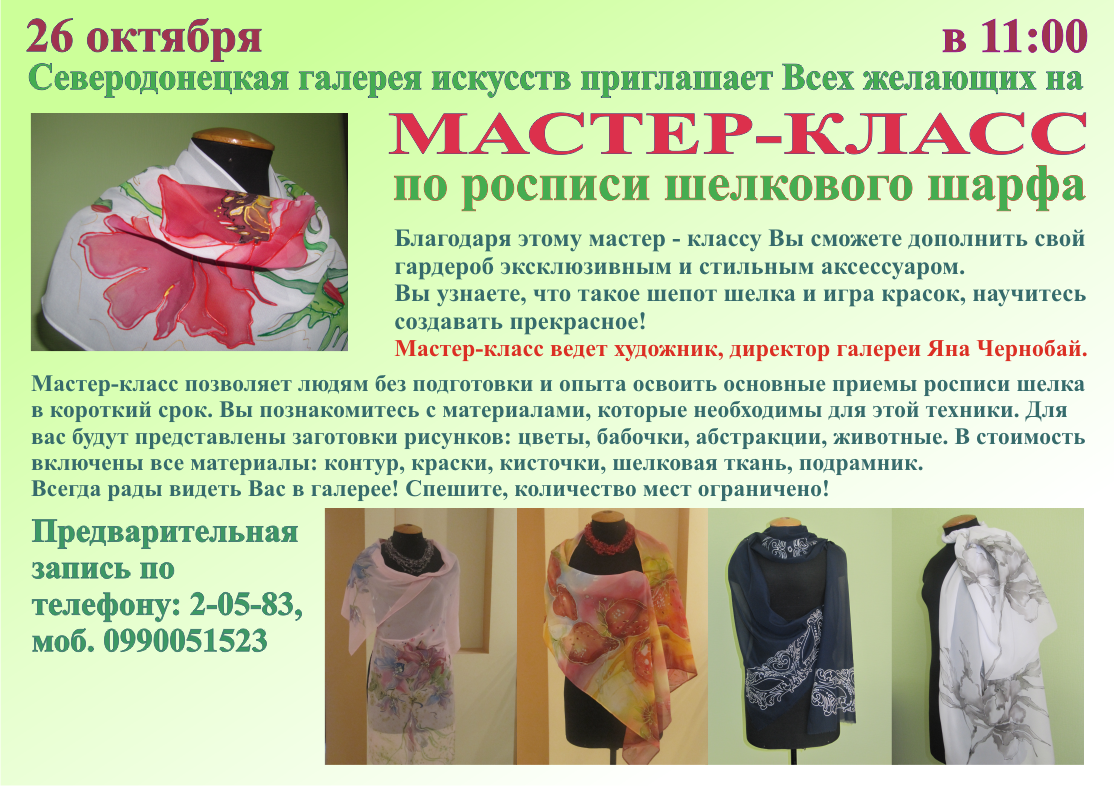 Мастер-класс позволяет людям без подготовки и опыта освоить основные приемы росписи шелка в короткий срок. Для вас будут представлены заготовки рисунков: цветы, бабочки, абстракции, животные. В стоимость включены все материалы: контур, краски, кисточки, шелковая ткань, подрамник.