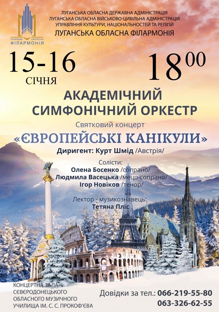 Луганська обласна філармонія запрошує Вас у чарівну зимову подорож разом із Академічним симфонічним оркестром. Глядачі мають змогу насолодитися музичними творами композиторів з Австрії, України, Франції та Італії. На чолі з австрійським диригентом Куртом Шмідом а також солістами Оленою Босенко, Людмилою Васецькою та Ігорем Новіковим, оркестр допоможе поринути у світ європейської музики та музики рідної землі. Програму святкового концерту "Європейські канікули" створено, щоб продемонструвати глядачеві шарм музики Франції, тонку та чуттєву душу України, музичну віртуозність Італіі, кращі музичні традиції Австрії.