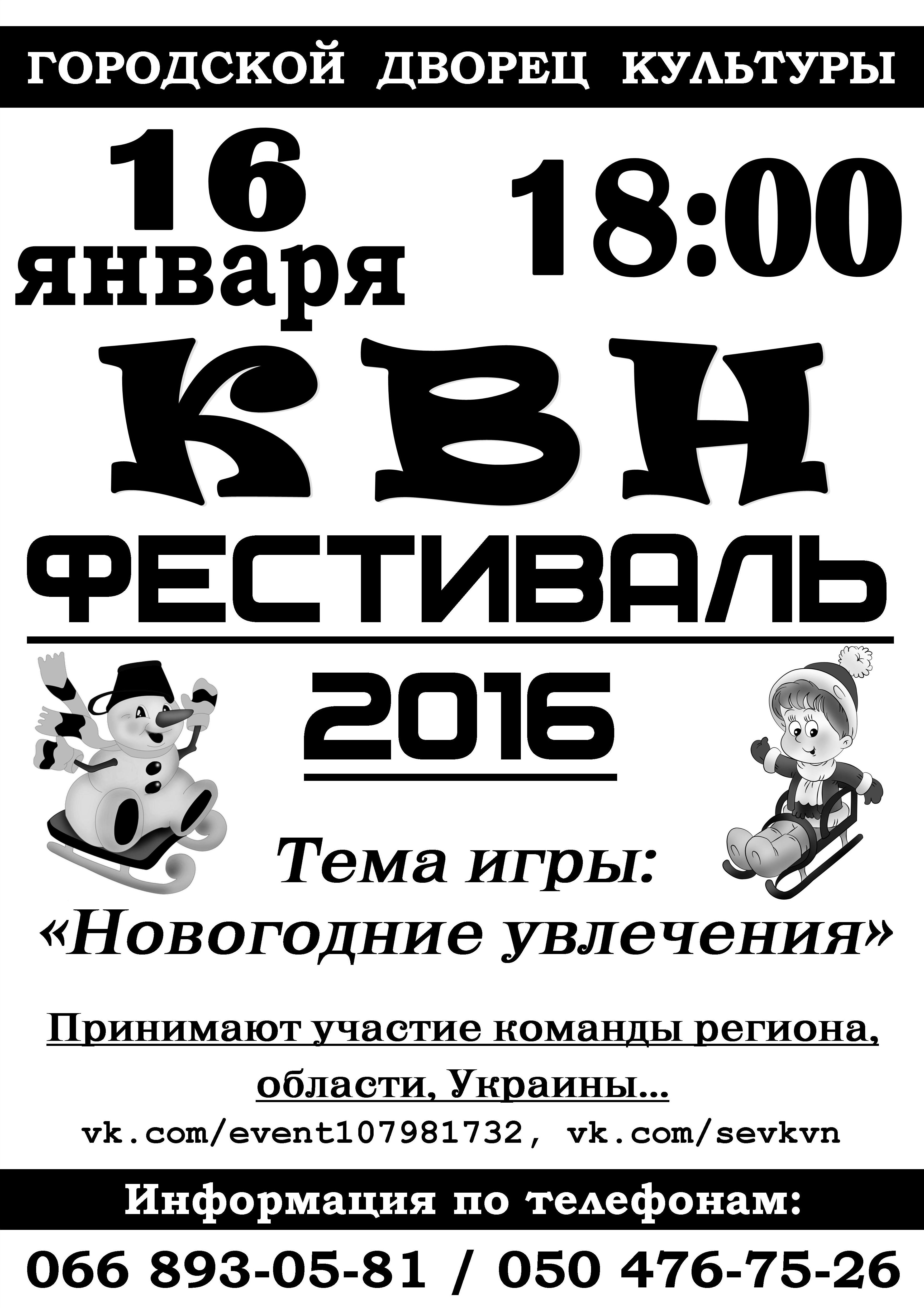 «Новогодние увлечения» - это тема отборочного Фестиваля команд КВН сезона 2016 года, который состоится в 18.00 в Городском Дворце культуры (ДК Строителей)