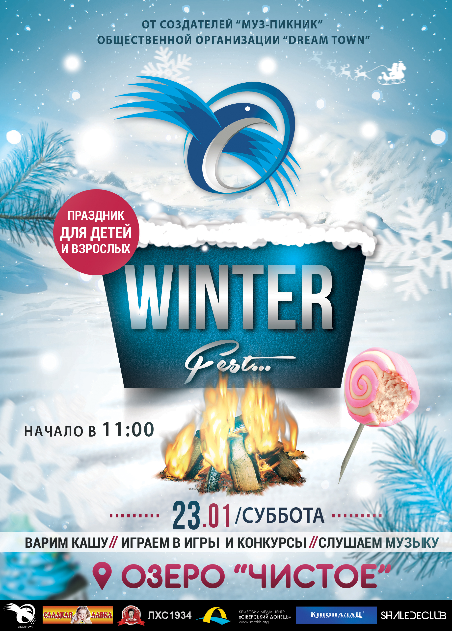 Наши друзья, общественная организация "Дрим Таун", приглашает всех Северодончан и гостей города на озеро "Чистое" 23-ого января в субботу в 11:00 посетить зимний праздник под названием "Dream Town Winter Fest".