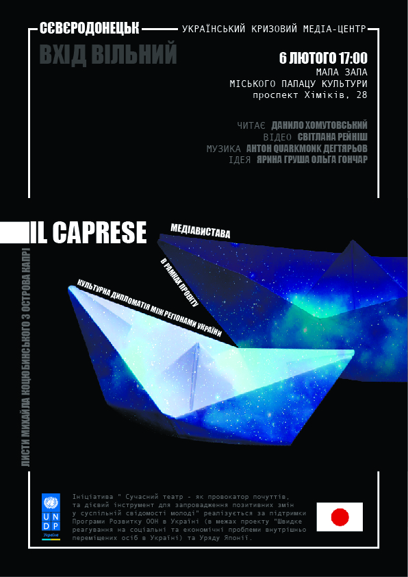 6 лютого, о 17:00 в Малій залі Міського палацу культури (проспект Хіміків, 28) відбудеться показ медіавистави «il Caprese: листи Коцюбинського з острова Капрі». Театральний перформанс розповідає про італійський період творчості українського письменника Михайла Коцюбинського та пропонує новий погляд на класичну літературу.