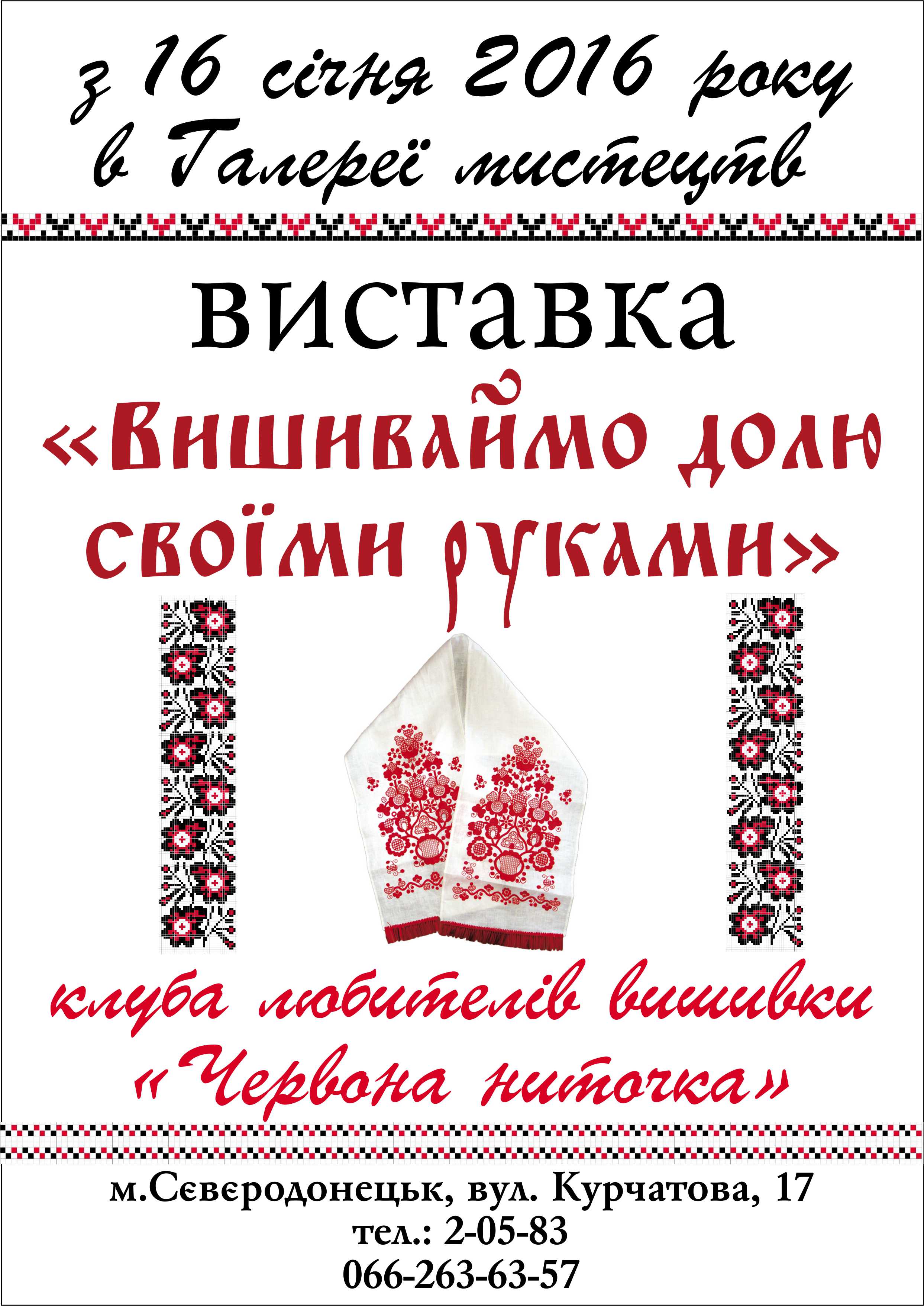 З 16 січня по 16 лютого Сєвєродонецька галерея мистецтв запрошує на виставку вишитих ікон і картин, рушників і вишиванок, панно та скатертин майстринь клубу любителів вишивки "Червона ниточка" (керівник - народна майстриня Луганщини В.М. Бєлянська).