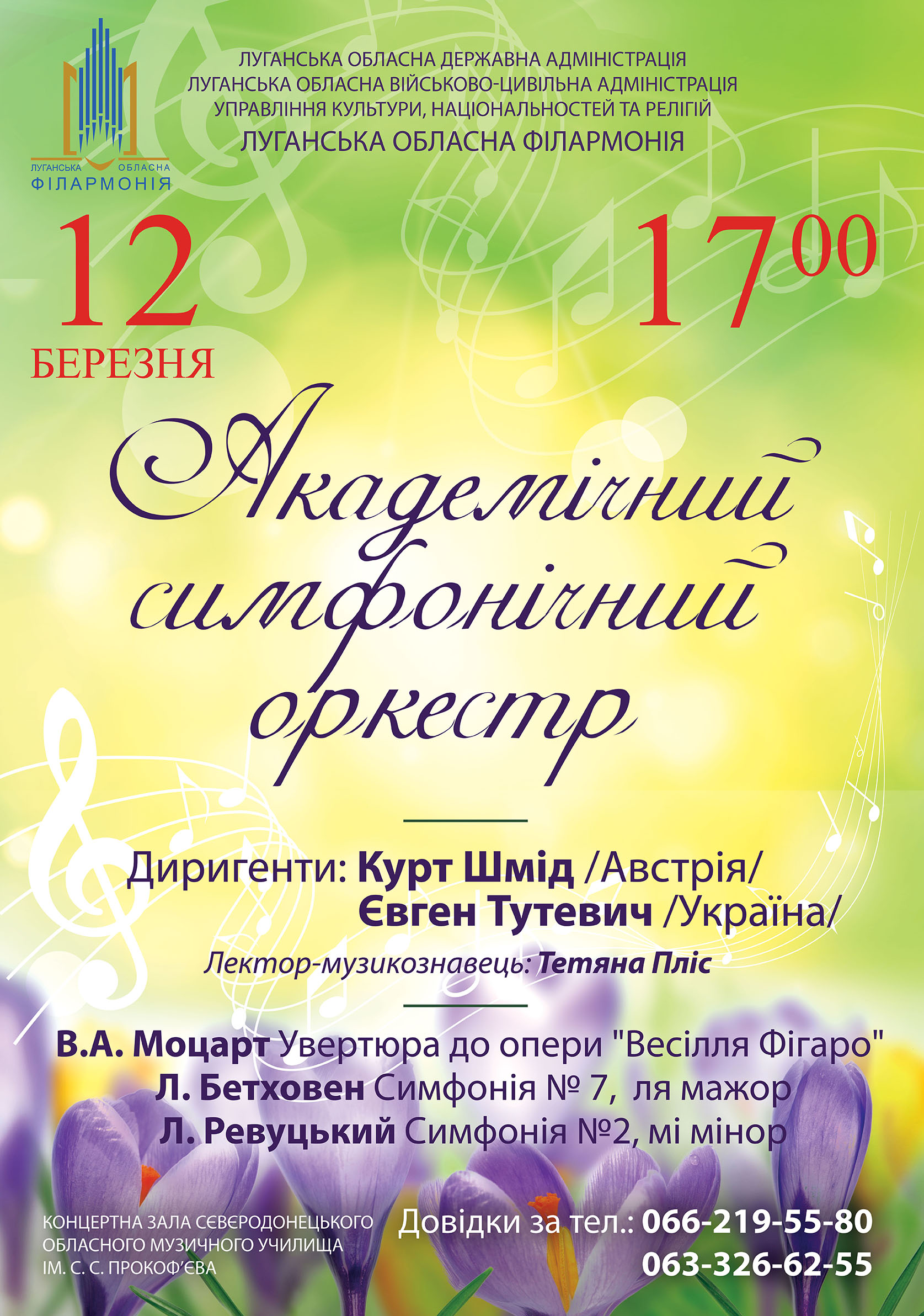 Луганська обласна філармонія запрошує всіх бажаючих на концерт Академічного симфонічного оркестру під керівництвом головного почесного австрійського диригента, Курта Шміда і головного диригента Євгена Тутевича. В цей чудовий вечір ви потрапите у казковий світ чарівних мелодій, які зуміли так точно передати атмосферу наступаючої весни.