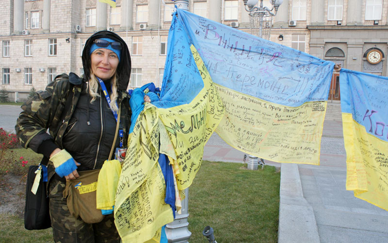 Активістка Катерина Валевська збирає Державні прапори України по всій країні. З міста в місто вона їде щоб передати прапор миру для підписання його жителями. Таких прапорів по Україні вже підписано 119.