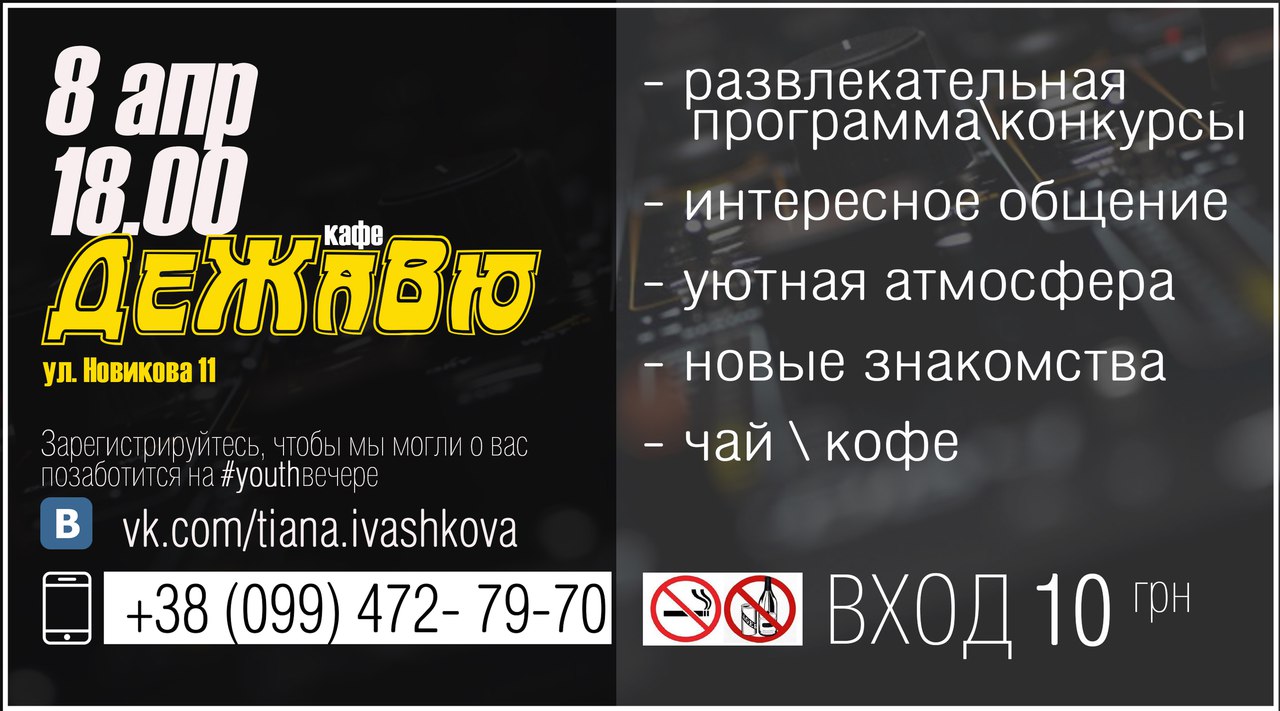 8 апреля в 18.00 в кафе "ДеЖаВю" состоится молодежный вечер.