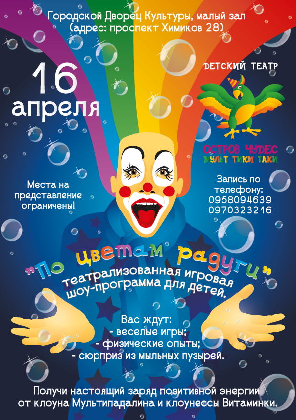 16 апреля в 10:00 в Городском Дворце Культуры(малый зал) состоится театрализованная игровая шоу-программа для детей "По цветам радуги" с веселым Клоуном Мультипадалином и зажигательной Клоунессой Витаминкой.