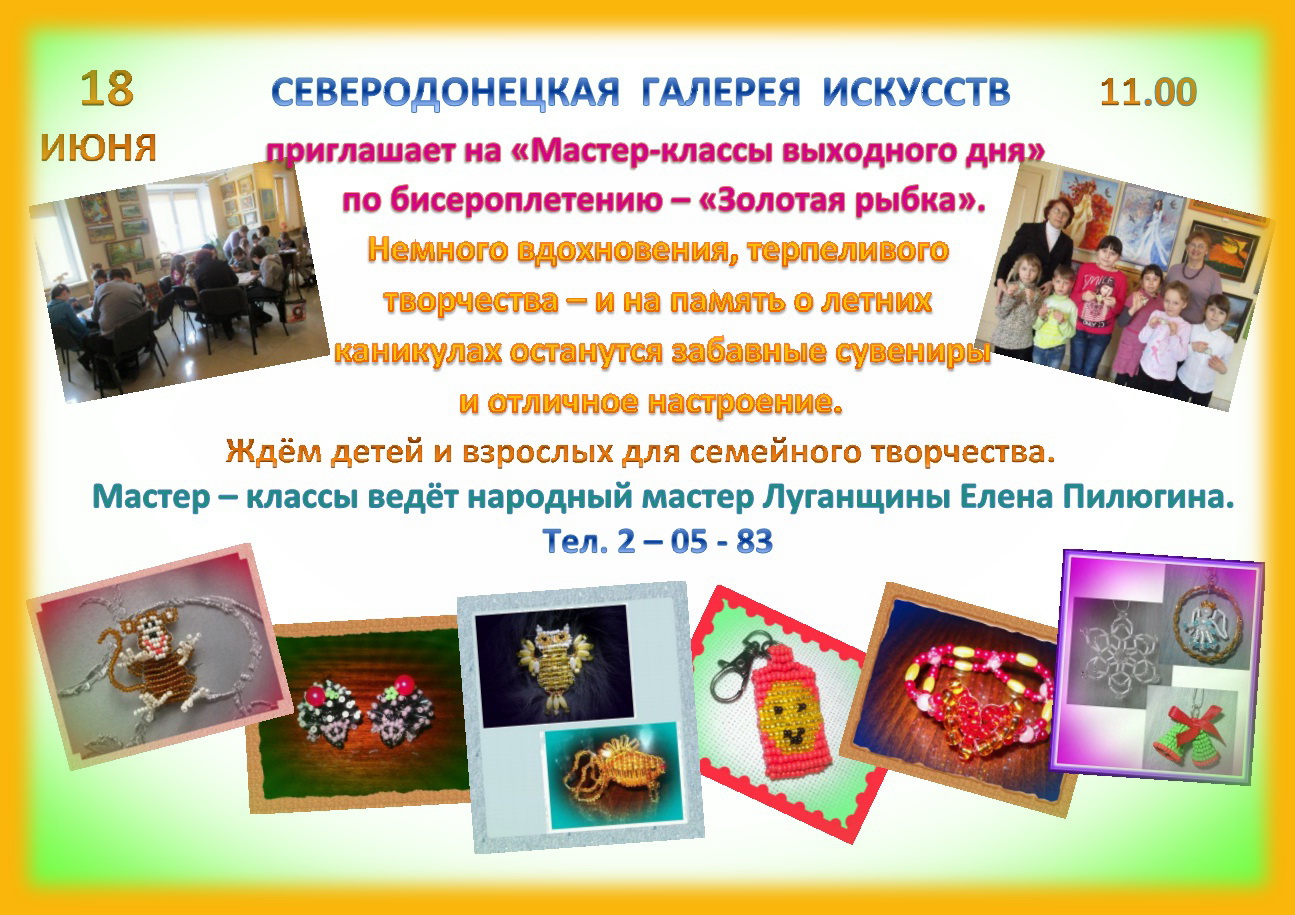 Сообщение: 18 червня о 11.00 у Сєвєродонецька галерея мистецтв запрошує відвідати майстер-клас вихідного дня "Золота рибка" народного майстра Луганщини Олени Пілюгіної.