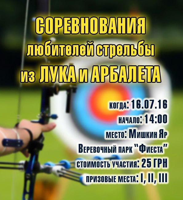 16.07.2016г. в 14-00 на территории Мишкиного Яра, возле Веревочного Парка состоятся любительские соревнования по стрельбе из лука и арбалета. Стоимость участия 25 грн. Соревнования будут проходить в несколько этапов.