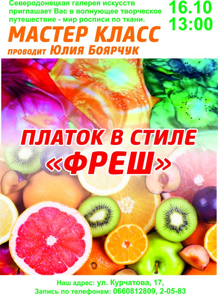 В субботу 15 октября в 13.00 Северодонецкая галерея искусств приглашает попробовать "на вкус" фруктовый фреш на мастер-класс по росписи по ткани. Предварительная запись по тел. 2-05-83, 066-08-12-809.