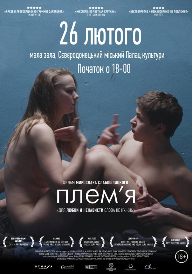 26 лютого о 18:00 в малій залі Міського Палацу Культури. Фільм: "Плем'я". Український кримінально-драматичний фільм про молодого хлопця, який прибуває до інтернату для глухих, де вступає в кримінальне угрупування "Плем'я".