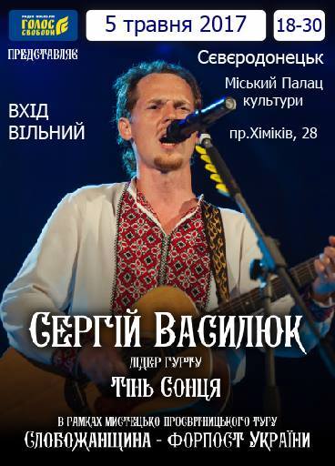 Шановні сєверодончани і гості міста! Запрошуємо вас 05 травня 2017 р. о 18-30 у велику заліу Сєвєродонецького Міського Палацу культури, де відбудеться творча зустріч з лідером гурту «Тінь Сонця» Сергієм Василюком, який завітає до нашого міста в рамках мистецько-просвітницького туру СЛОБОЖАНЩИНА - ФОРПОСТ УКРАЇНИ.