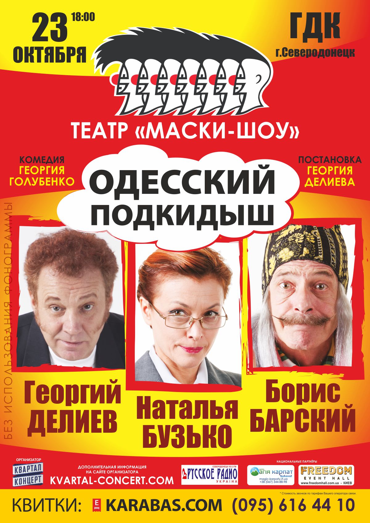 Одесский подкидыш спектакль – это удивительная история, которая случилась в «жемчужине Черного моря». Вы станете свидетелем настоящей комедии с веселым и увлекательным сюжетом, который буквально доведет вас до слез, ведь искрометные шутки и нелепые ситуации позволят посмеяться от души. Блистательная игра актерской труппы позволит в полной мере окунуться в захватывающее театральное действо. В главных ролях вы увидите Народных артистов Украины Георгия Делиева и Бориса Барского, а также Заслуженную артистку Украины Наталию Бузько. Фейерверк эмоций вместе с отличным настроением – это минимум того, что ожидает зрителей на спектакле знаменитого театра «Дом клоунов».