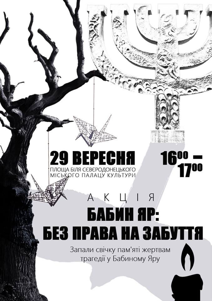 29 вересня з 16 до 17 години прийди і долучися до всесвітньої Акції - запали свічку пам’яті трагедії у Бабиному яру на площі біля Сєвєродонецького міського Палацу культури з метою вшанування жертв злочинів, скоєних нацистами під час окупації України, − мирних жителів усіх національностей, військовополонених, учасників українського визвольного руху.