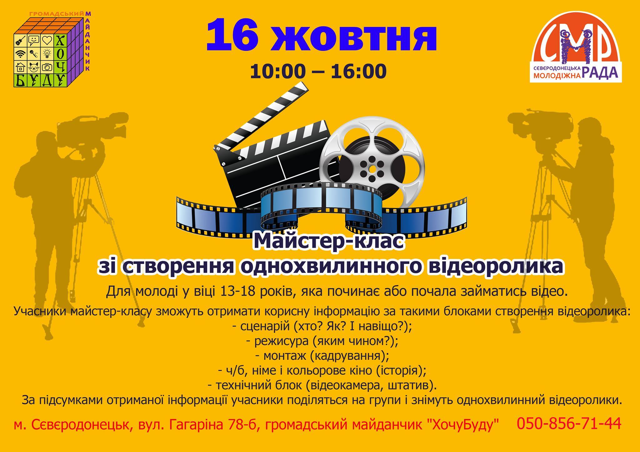 Громадська організація «Сєвєродонецька молодіжна рада» разом з ініциативною молоддю запрошують молодих людей у віці 13-18 років, які займаються або хочуть розпочати роботу з відео (сценарій, режисура, зйомка, монтаж) взяти участь у майстер-клас зі створення однохвилинного відеоролика.