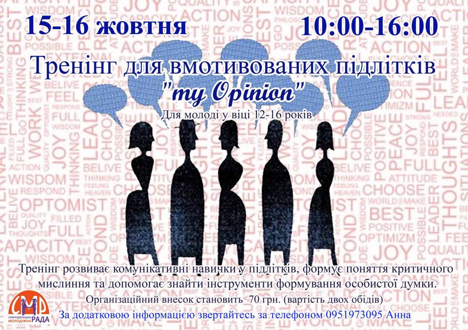 Тренінговий курс «my opinion» пропонується вмотивованим підліткам, які прагнуть особистого розвитку, мають власну думку та бажають поділитися нею з оточуючими.