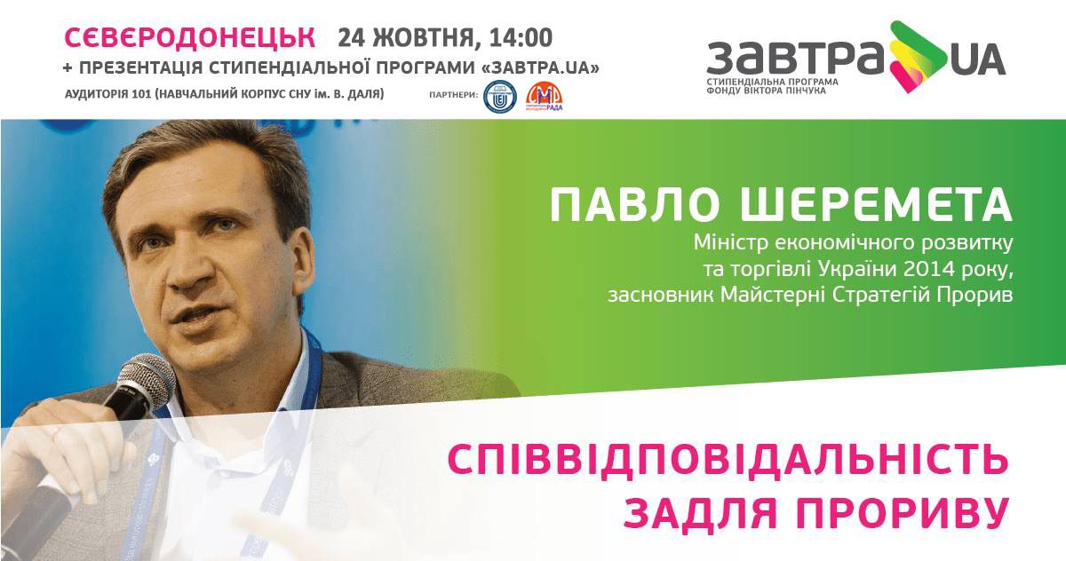 На запрошення Громадської організації «Сєвєродонецька молодіжна рада» та Студентської ради Східноукраїнського національного університету імені Володимира Даля, наше місто відвідає Павло Шеремета, Міністр економічного розвитку та торгівлі України 2014 року, засновник Майстерні стратегій «Прорив».