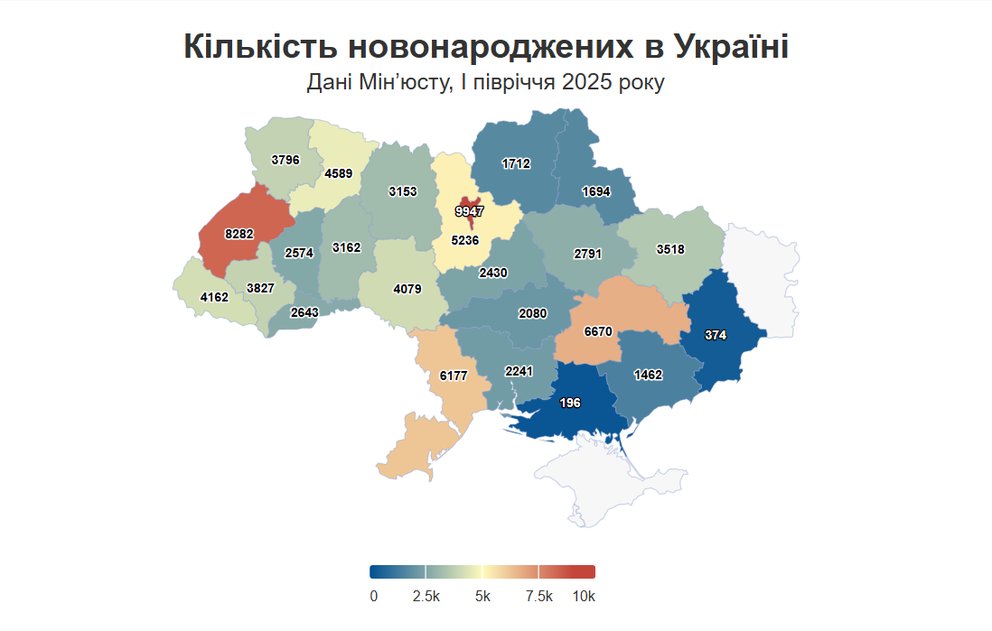 "Водночас у регіонах, наближених до лінії фронту, очікувано на світ приходить менше дітей. На Донеччині за рік народжуваність скоротилась майже удвічі (-47%), на Херсонщині — на 11% та на Чернігівщині на 10%", - зазначається у повідомленні.