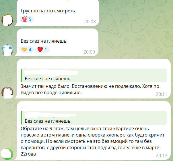 “Сумно на це дивитися”, “Без сліз не глянеш”, - пишуть під відео коментатори. Один з них згадує, що під'їзд, який демонтують, горів ще у березні 2022 року.