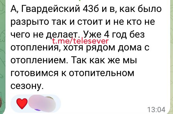 “Гвардійський 43 Б та В як було розрито, так і стоїть. І ніхто нічого не робить. Уже четвертий рік без опалення, хоча поруч будинки з опаленням”, - пишуть містяни.