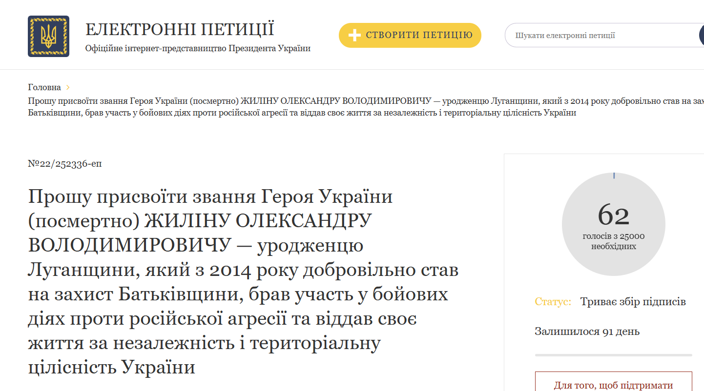 “Луганщина втратила в його особі більше, ніж воїна. Це була людина, яка завжди прагнула ділитися знаннями, підтримувати молодь та виховувати наступні покоління. Він міг стати тим, хто надихає й навчає майбутнє свого краю. Для нас дуже важливо, щоб завдяки цій нагороді пам’ять про нього жила не лише на Луганщині. Вся Україна має знати, що й серед наших земляків є герої — можливо, не такі відомі, але ті, хто зробив величезний внесок у захист суверенітету держави. Я прошу вас, пане президенте, вшанувати його пам’ять найвищою державною нагородою — званням Героя України (посмертно)”, – сказано у тексті петиції.