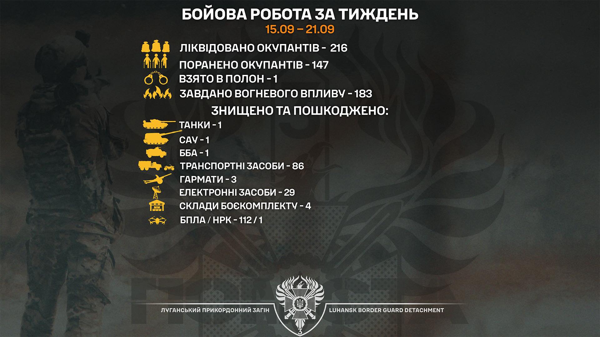 183 прицільних вогневих удари завдали прикордонники бригади «Помста» по місцях розміщення окупантів на Краматорському, Сіверському, Куп’янському напрямках та в районі Серебрянського лісництва з 15 по 21 вересня. Ліквідували 216 окупантів, 147 поранили та одного взяли у полон.