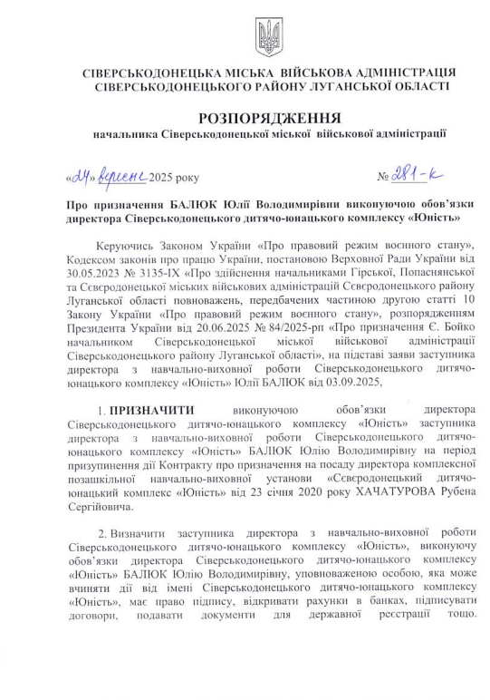 Керівниця Сіверськодонецької МВА Євгенія Бойко підписала розпорядження про призначення виконуючого обов’язки Сіверськодонецького дитячо-юнацького комплексу «Юність».