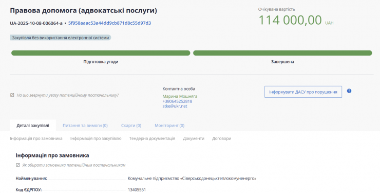 Комунальне підприємство «Сєвєродонецьктеплокомуненерго» ще раз замовило послуги з юридичного консультування та юридичного представництва. Цього разу – на 114 тисяч гривень.
