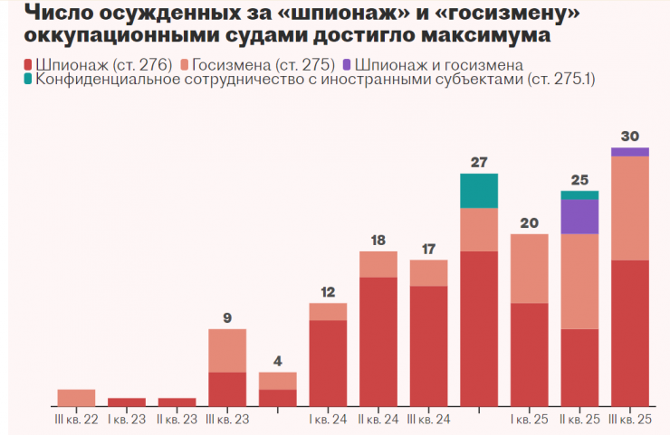 «Дві третини вироків припадають на статтю про шпигунство, за якою в росії судять іноземних громадян і осіб без громадянства, у даному випадку — власників українських паспортів. Однак в останній рік зростає кількість вироків і за статтею про державну зраду — за нею судять громадян росії (жителів «нових регіонів» системно примушують отримувати російські паспорти: без них неможливо влаштуватися на роботу, отримати пенсію або медичну допомогу)», — пишуть «Важливі історії».