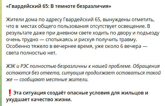 «Гвардійський, 65, перший поверх. Ледь ходиш тут. У місцях загального користування світла немає. Виходить, приходиш сюди вночі...Навіть не вночі, а о шостій вечора. І що? Лежать «таври» 120-ті чи 150-ті. Йдеш, нічого не видно, натикаєшся - й убиваєшся. ЖЕКу на все це по барабану, РЕМу - так само. І з під’їзду виходиш - світла немає... все вимкнув РЕМ», - каже чоловік на відео.