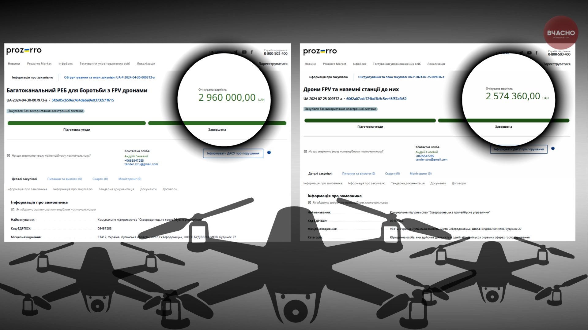 «... у Сіверськодонецьку благородна ідея перетворилася на зручну схему. Під прикриттям оборонних потреб посадовці місцевої військової адміністрації, за даними слідства, разом з керівництвом КП «Сєвєродонецьке тролейбусне управління» організували ймовірно фіктивні закупівлі FPV-дронів і станцій радіоелектронної боротьби (РЕБ). За версією детективів, замість реальних постачань вони створювали повну імітацію процесу — з договорами, актами та накладними, — тоді як гроші перераховувалися через підконтрольні приватні фірми й надалі виводилися у готівку», — пише «Вчасно».