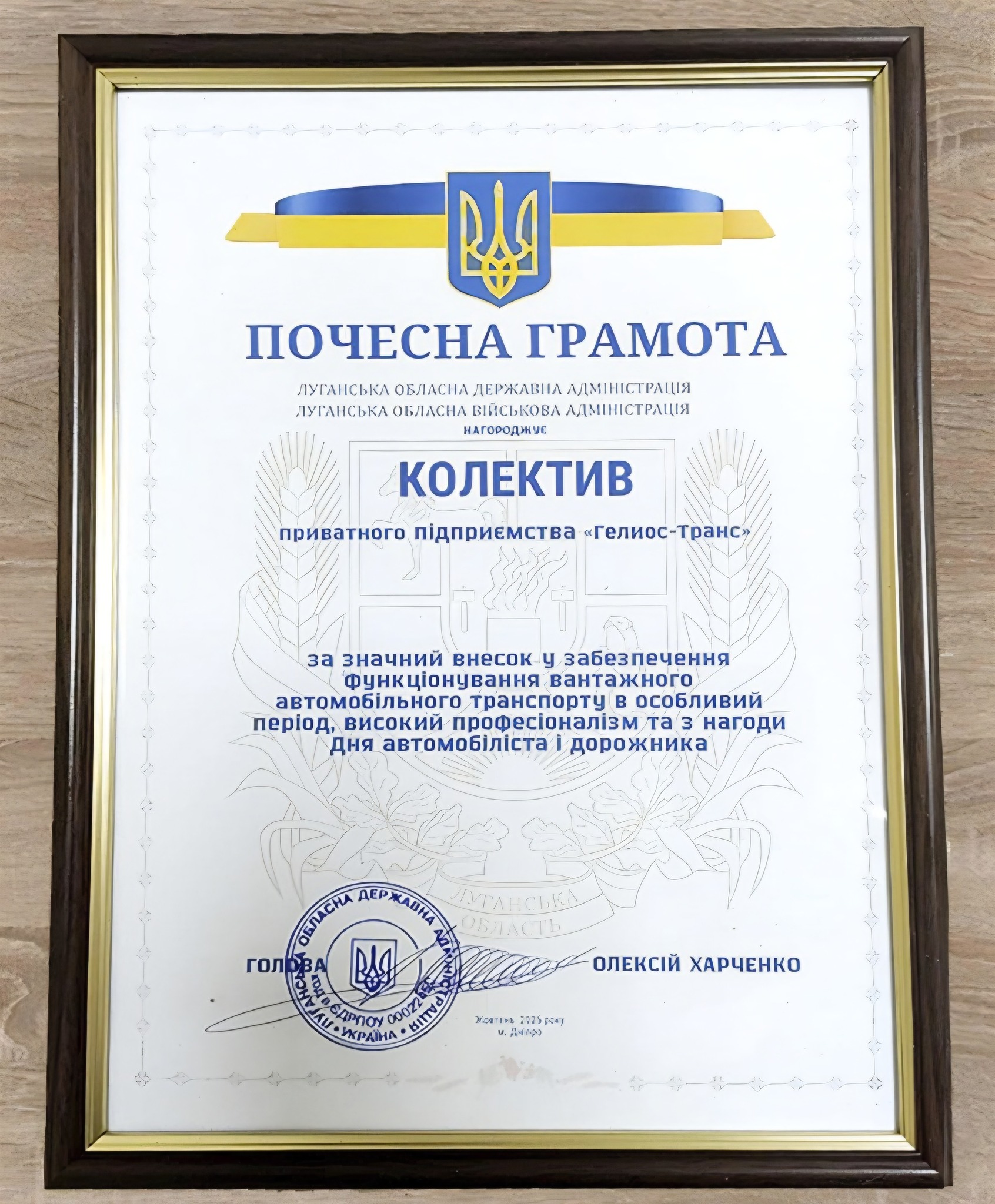 Напередодні Дня автомобіліста і дорожника, який щорічно відзначають в останню неділю жовтня, очільник Луганщини нагородив колектив приватного підприємства «Гелиос-Транс» Почесною грамотою обласної державної адміністрації. Цю нагороду вручили за значний внесок у забезпечення функціонування вантажного автомобільного транспорту в особливий період, високий професіоналізм та з нагоди Дня автомобіліста і дорожника.