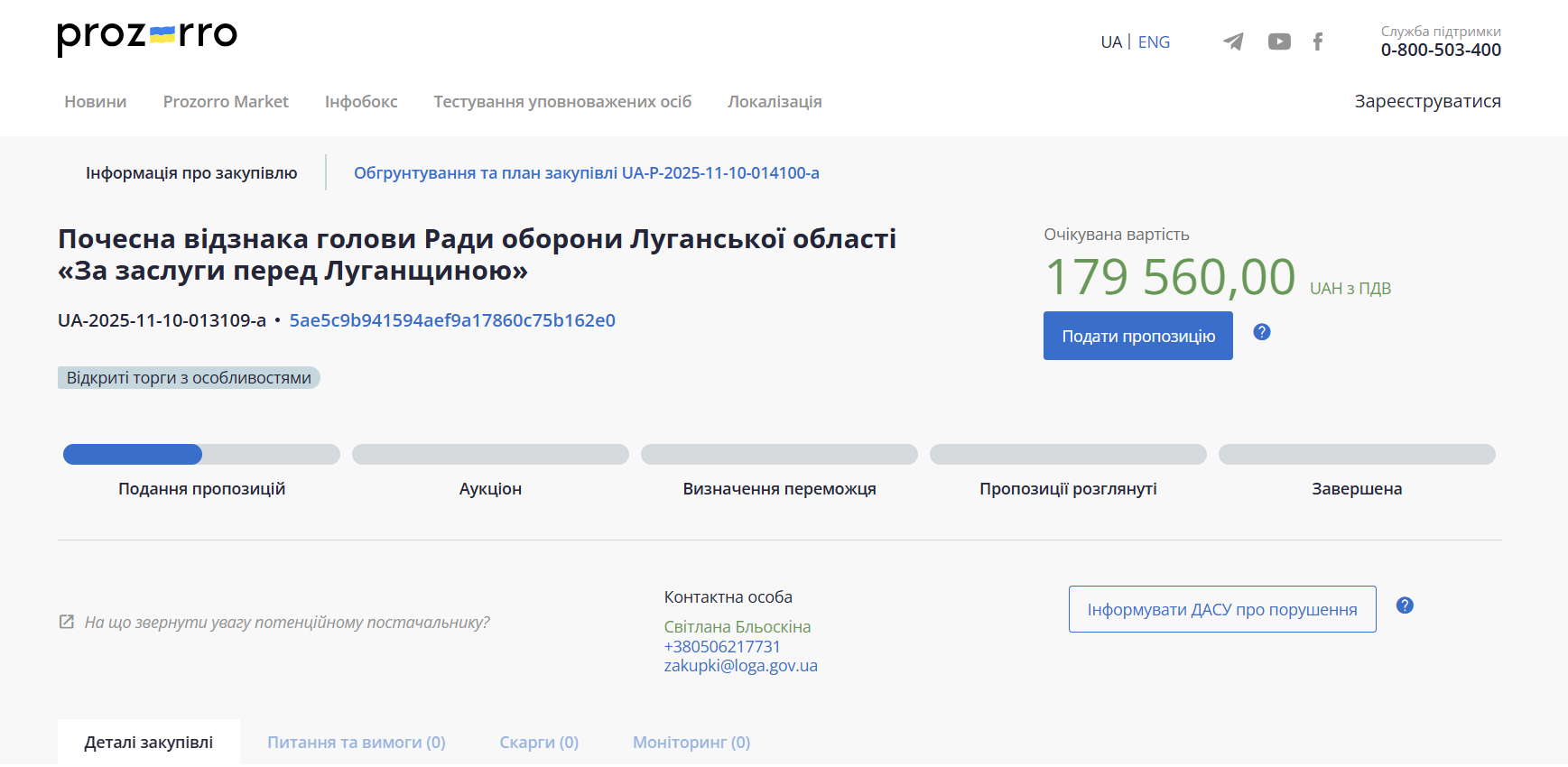 Очікувана вартість: 179 560 гривень.