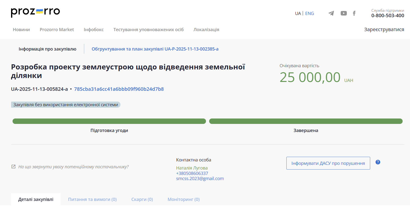 За 25 тисяч гривень центр замовив послуги з розроблення проєкту землеустрою щодо відведення земельної ділянки по вул. Юності, 2-В у Самарі з цільовим призначенням земельної ділянки для будівництва та обслуговування багатоквартирного житлового будинку, орієнтовною площею – 0,3000 га.