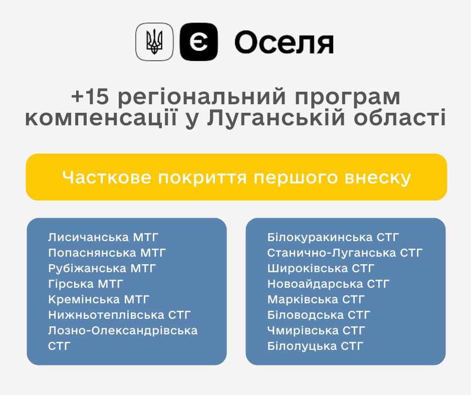 15 територіальних громад Луганщини запровадили власні програми компенсації для внутрішньо переміщених осіб за програмою “єОселя”. Місцеві адміністрації покриватимуть частину першого внеску за кредитом для зареєстрованих жителів своїх громад.