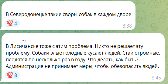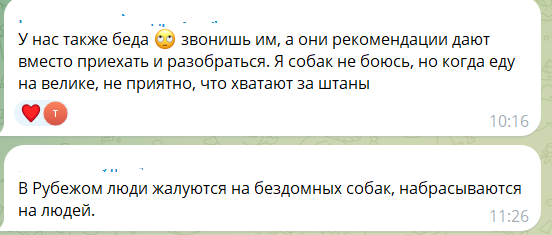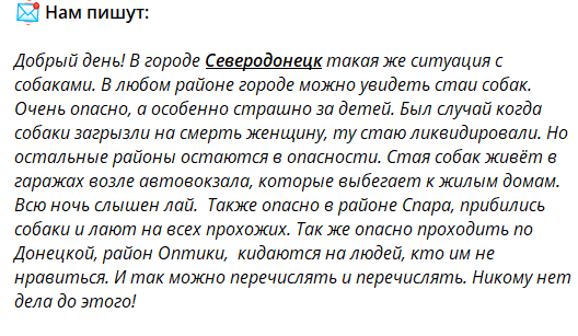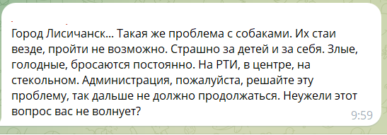 «Місто Лисичанськ. Така ж проблема з собаками. Їхні зграї всюди, пройти неможливо. Страшно за дітей та себе. Злі, голодні, кидаються постійно. На РТІ, у центрі, на стекольному. Адміністрація, будь ласка, розв'язуйте цю проблему, так далі не має продовжуватися. Невже це питання вас не хвилює?» - пише коментаторка.