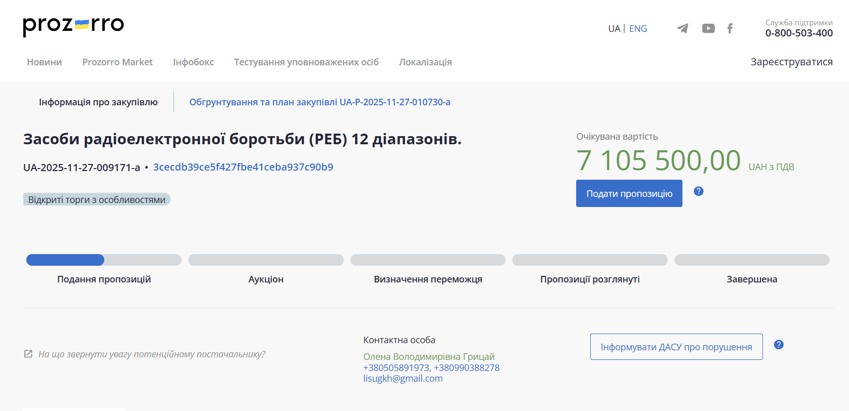 Очікувана вартість: 7 105 500 гривень. На цю суму планують закупити 15 засобів радіоелектронної боротьби (РЕБ) 12 діапазонів.