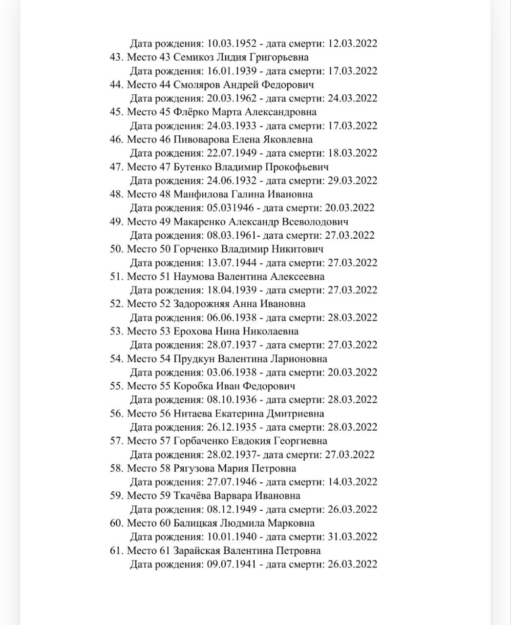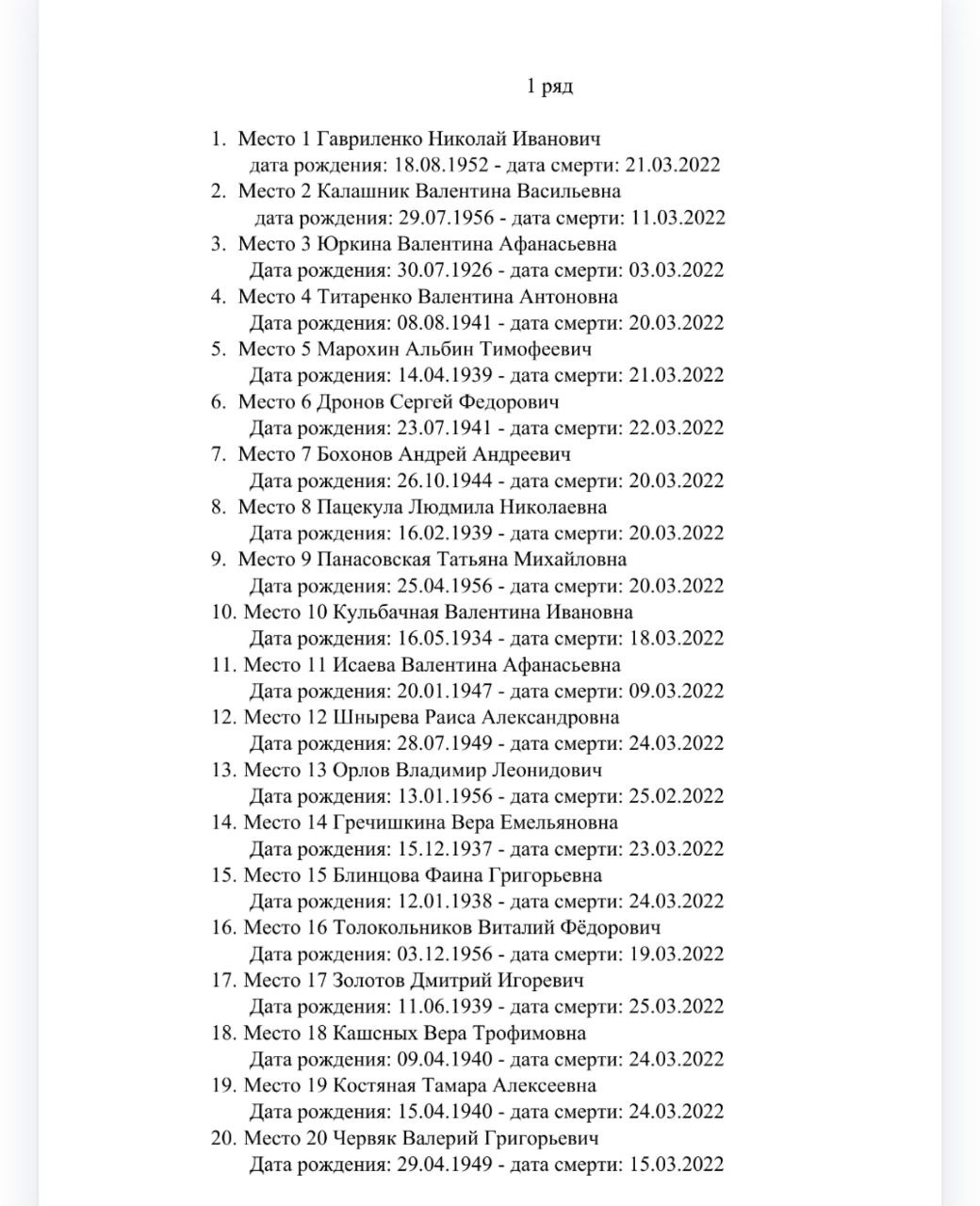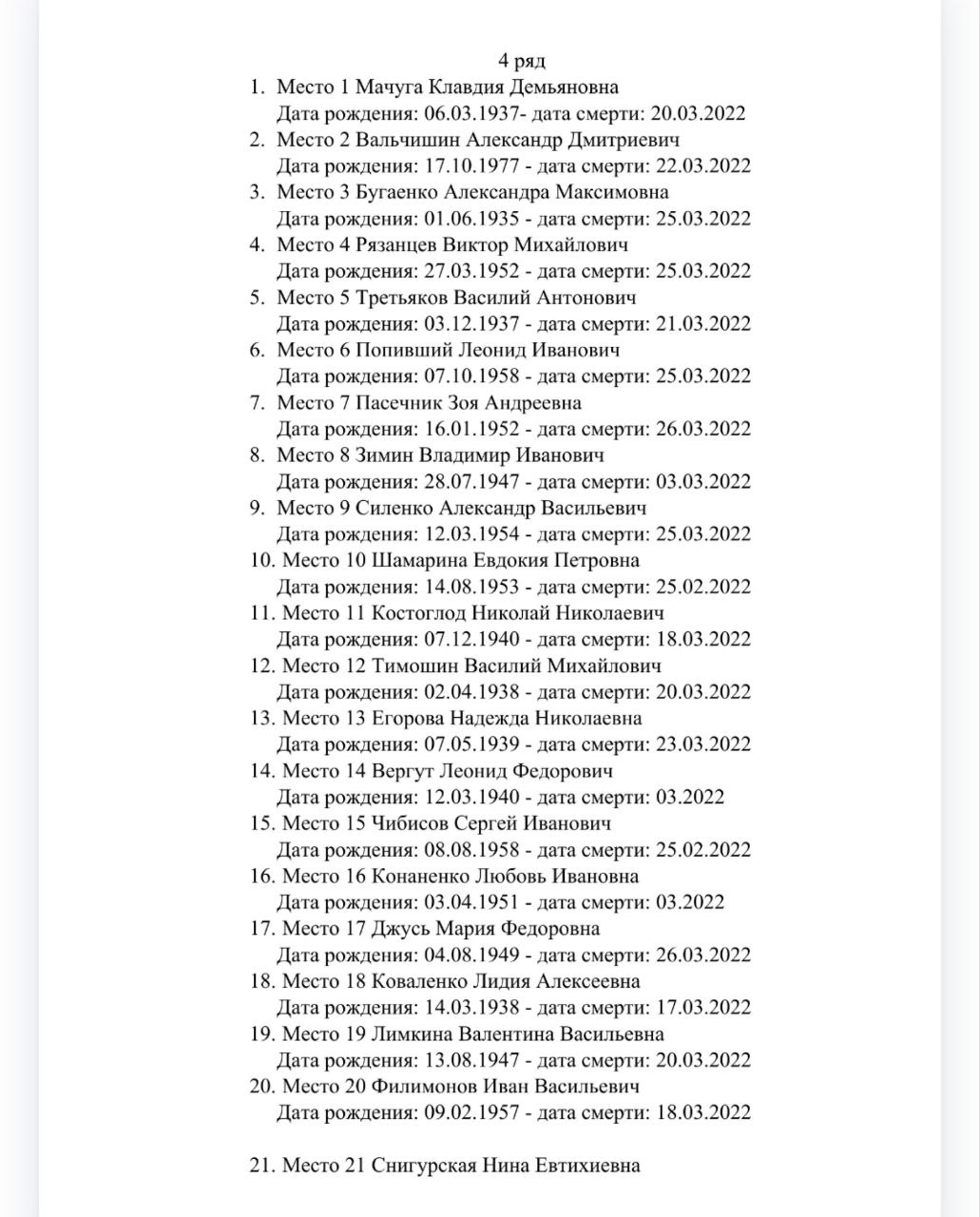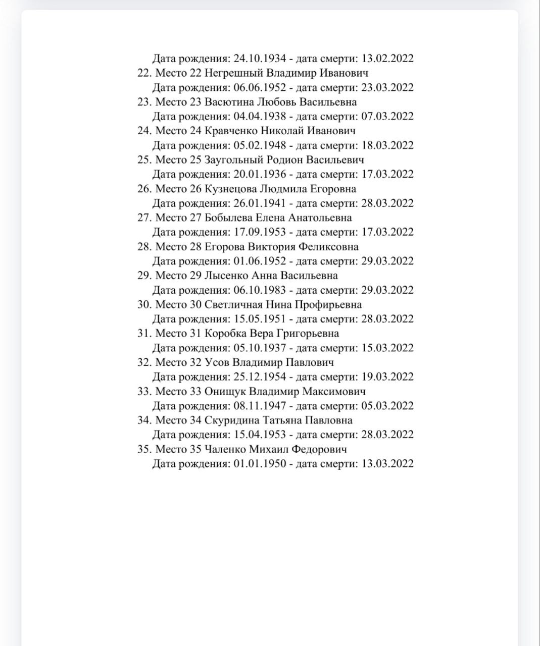 З метою встановлення осіб, похованих під табличками з зазначеними у списку даними, їхніх родичів запрошують звернутися до окупаційної адміністрації Сіверськодонецька для визначення місця, дати та часу проведення слідчих дій, у тому числі - відбору біоматеріалу.