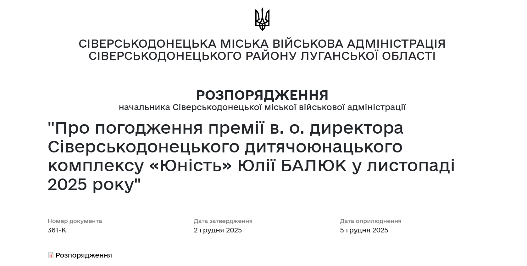 Керівниця Сіверськодонецької МВА Євгенія Бойко підписала розпорядження "Про погодження премії в. о. директора Сіверськодонецького дитячо-юнацького комплексу “Юність” Юлії Балюк у листопаді 2025 року".
