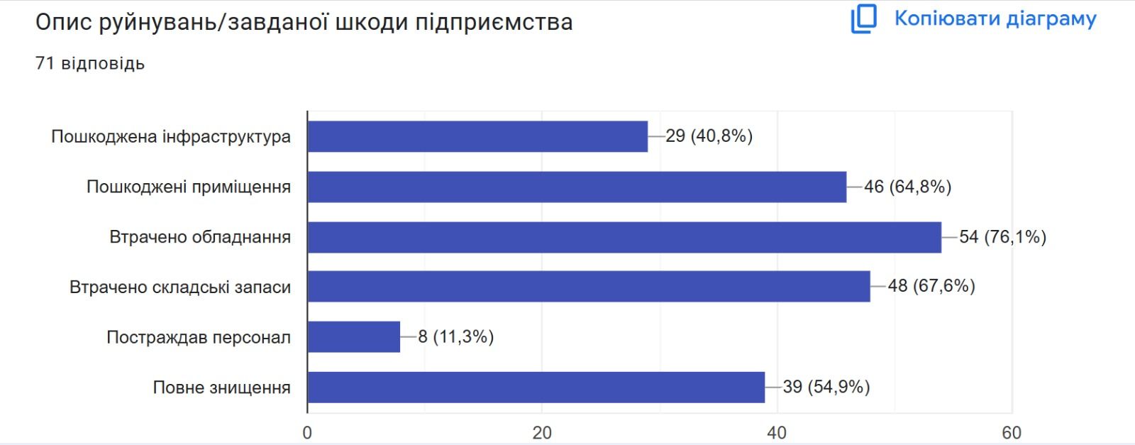 Так, у 39 відповідях (54,9%) повідомили про повне знищення підприємств. У 8 випадках (11,3%) - про постраждалий персонал. У 76,1% підприємств, які взяли участь в анкетуванні, втрачене обладнання.