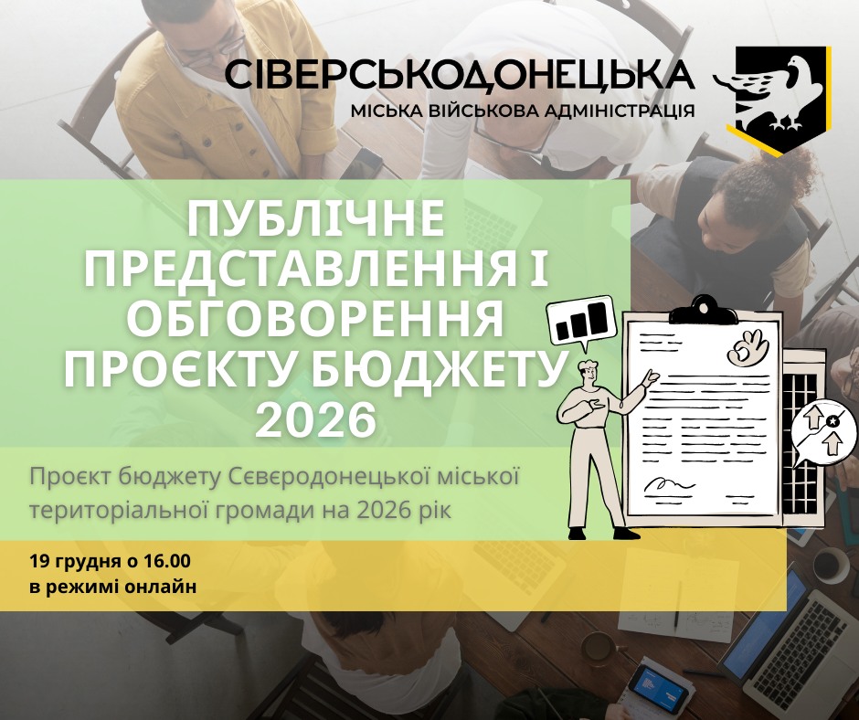 Публічне представлення й обговорення проєкту бюджету Сіверськодонецької міської територіальної громади на 2026 рік відбудеться 19 грудня 2025 року о 16.00 в режимі онлайн.