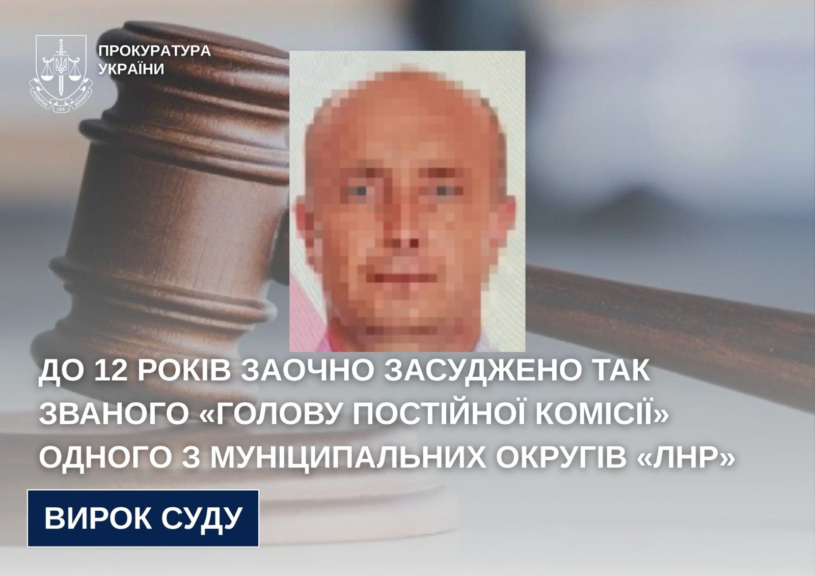 Мешканця Білолуцька заочно засудили до 12 років позбавлення волі з конфіскацією майна за колабораційну діяльність (ч. 5 ст. 111-1 КК України). Суд ухвалив таке рішення за публічного обвинувачення прокурорів Луганської обласної прокуратури.