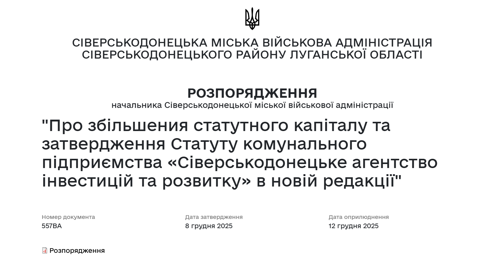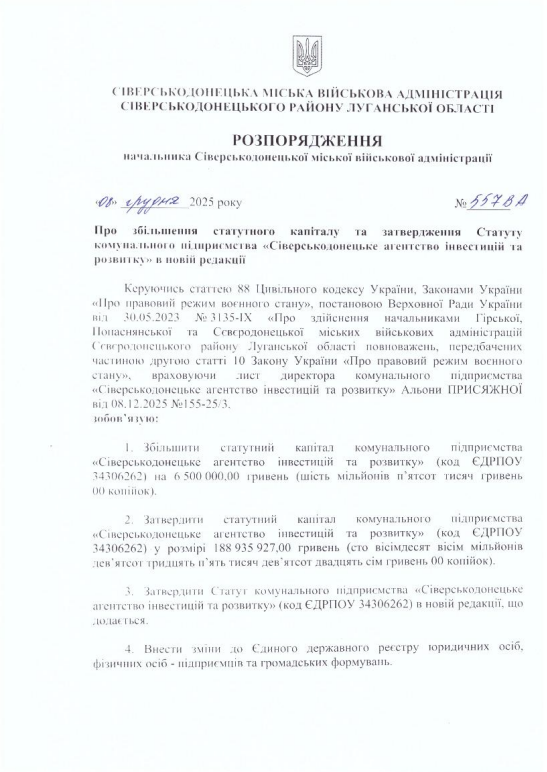 Керівниця Сіверськодонецької МВА Євгенія Бойко підписала розпорядження "Про збільшення статутного капіталу та затвердження Статуту комунального підприємства “Сіверськодонецьке агентство інвестицій та розвитку” в новій редакції".