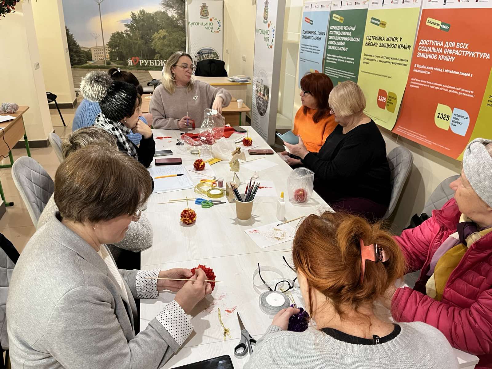 Фахівці Рубіжанського центру надання соціальних послуг спільно з колегами комунального закладу «Центр культури, дозвілля, туризму і спорту Новопсковської селищної ради» організували тематичну зустріч для жінок із числа внутрішньо переміщених осіб, метою якої стало психологічне перезавантаження учасниць засобами арттерапії.