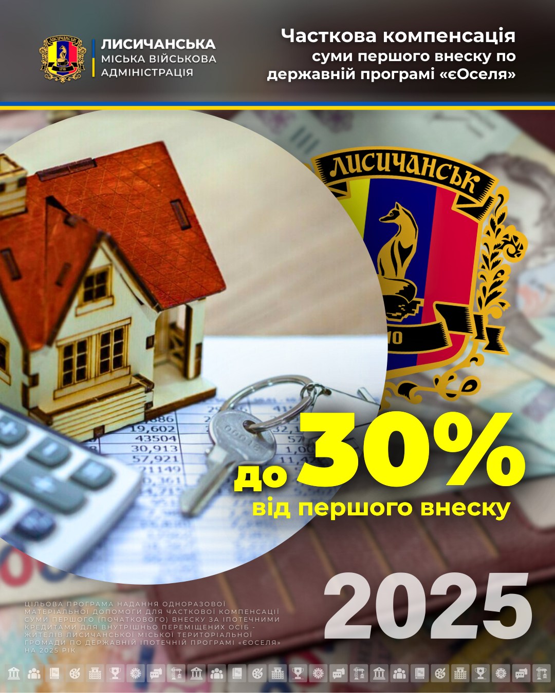 Триває реалізація Цільової програми надання одноразової матеріальної допомоги для часткової компенсації суми першого (початкового) внеску за іпотечними кредитами для ВПО - жителів Лисичанської МТГ за державною іпотечною програмою «єОселя» на 2025 рік.