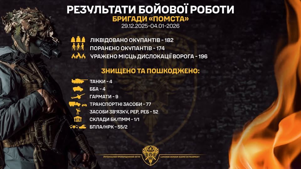 Протягом тижня, з 29 грудня по 4 січня, бійці бригади “Помста” по місцях дислокації та позиціях ворога завдали 196 ударів. Ліквідували 182 окупантів, ще 174 – поранили.
